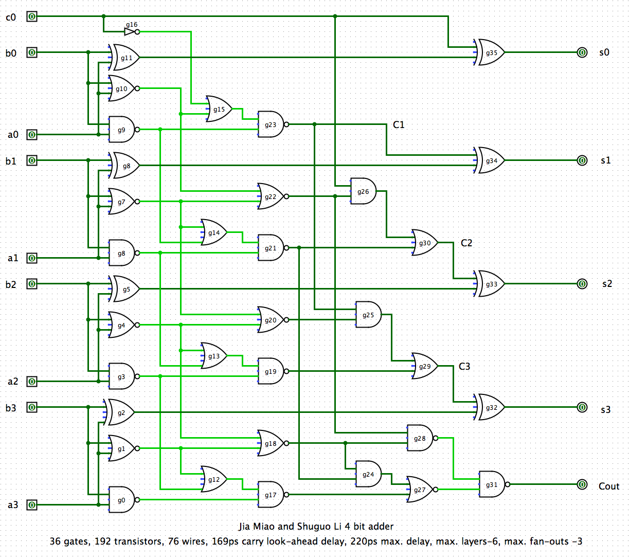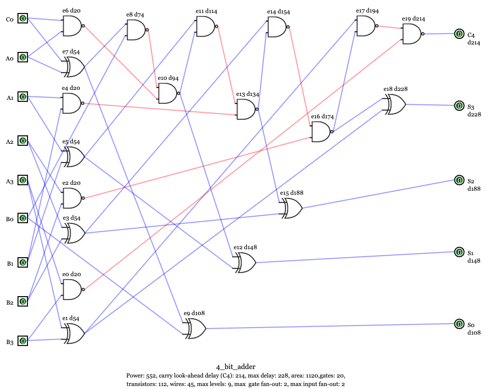 2. Power: 913, carry look-ahead delay: 247 ps , maximum delay: 273 ps , Area: 1737, 6 levels, 32 gates, 228 transistors, 72 wires, max fan-out: 6