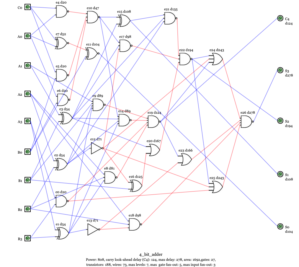 2. Power: 913, carry look-ahead delay: 247 ps , maximum delay: 273 ps , Area: 1737, 6 levels, 32 gates, 228 transistors, 72 wires, max fan-out: 6