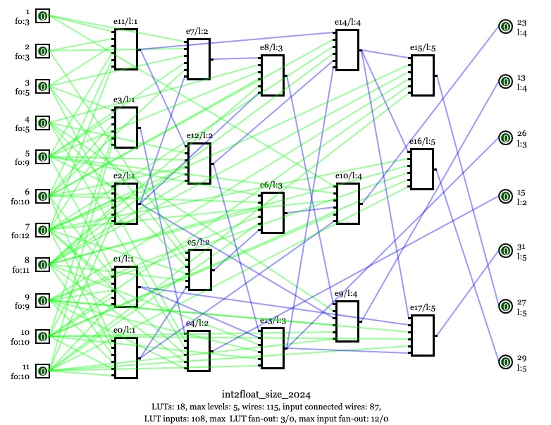 Below is an example comparing the best published Int to float converter design (int2float_size_2024) from the IPFL benchmark 2024 with GTs’ improved versions.Original (int2float_size_2024):